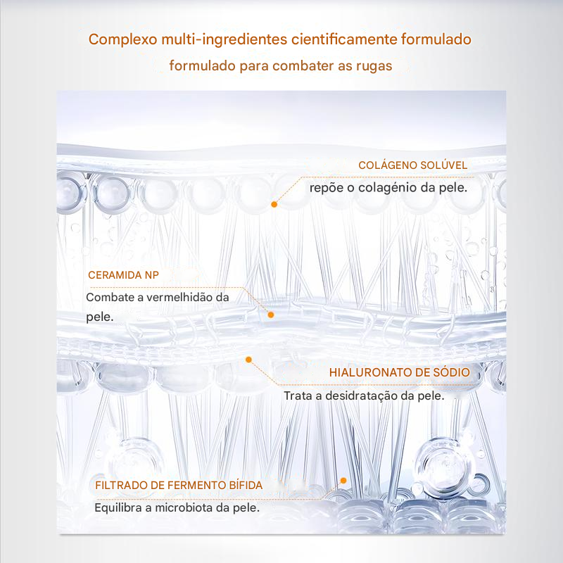 Resposta 1: Este produto foi formulado para reduzir visualmente as rugas e linhas de expressão, melhorando a elasticidade da pele e promovendo um aspeto mais jovem e saudável. Contém ingredientes ativos que hidratam e revitalizam profundamente a pele, proporcionando um efeito lifting imediato.